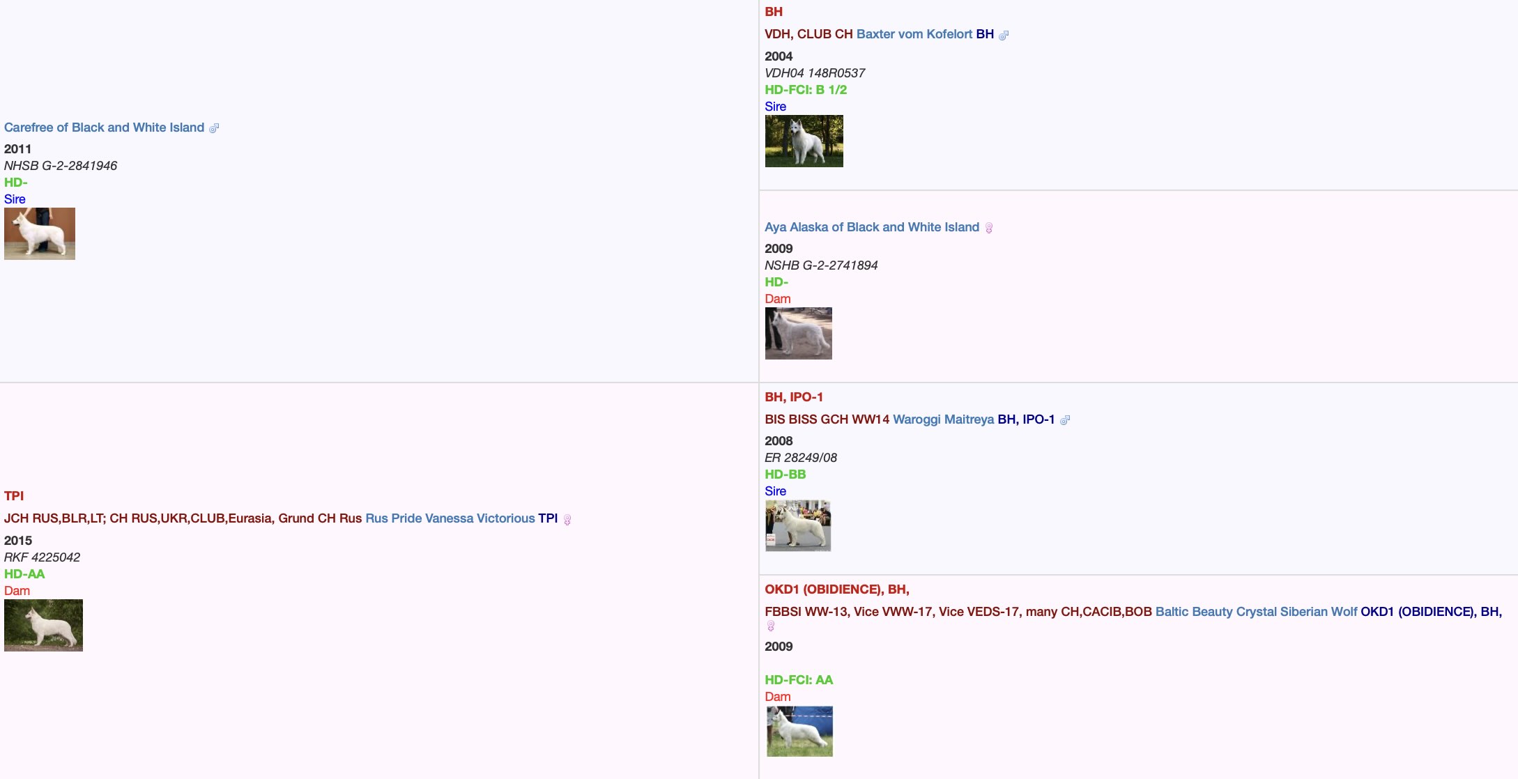 Такая комбинация производителей позволяет рассчитывать на потомство с крепкой анатомией, стабильной психикой и красивым экстерьером. Щенки наследуют мощный костяк, правильный формат корпуса и характерный для белой швейцарской овчарки интеллигентный темперамент.