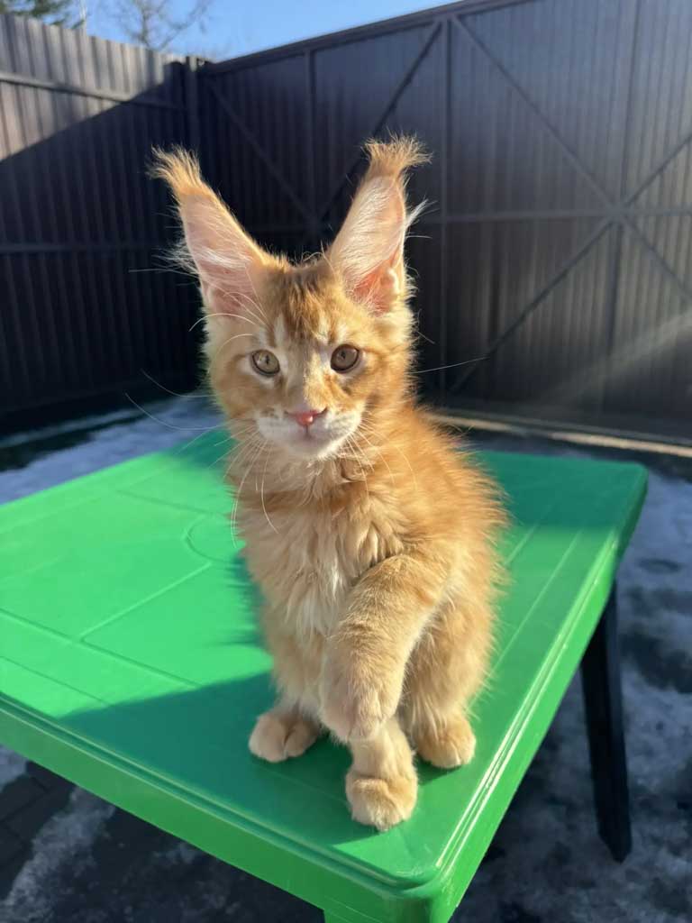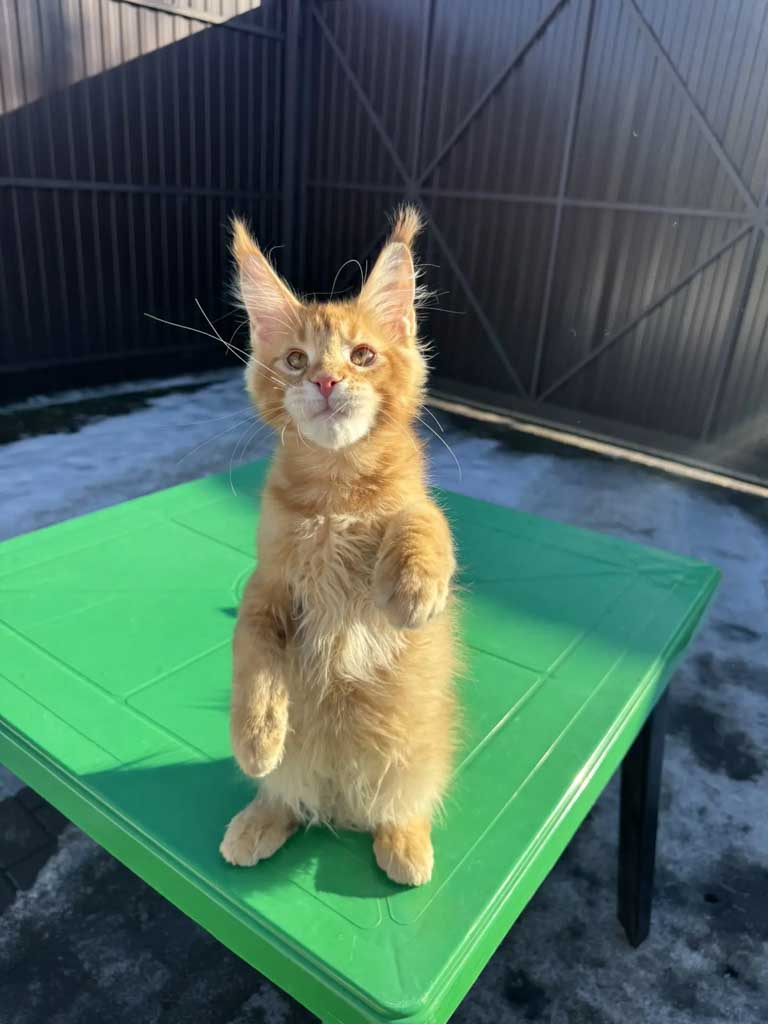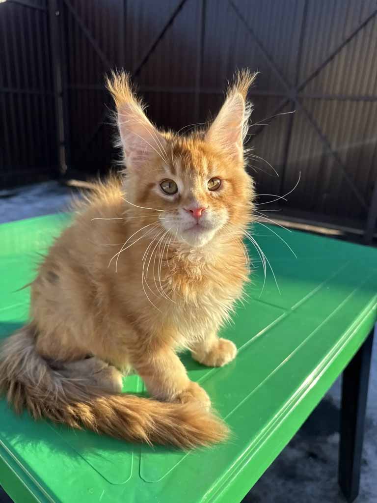 Unicum Satine — котёнок с ярким окрасом красный тикированный табби (d25) и выразительными кисточками на ушах. У него гармоничные пропорции тела, длинные лапы и правильный профиль головы. Уже сейчас заметна породная элегантность, которая характерна для качественных линий мейн-кунов.
