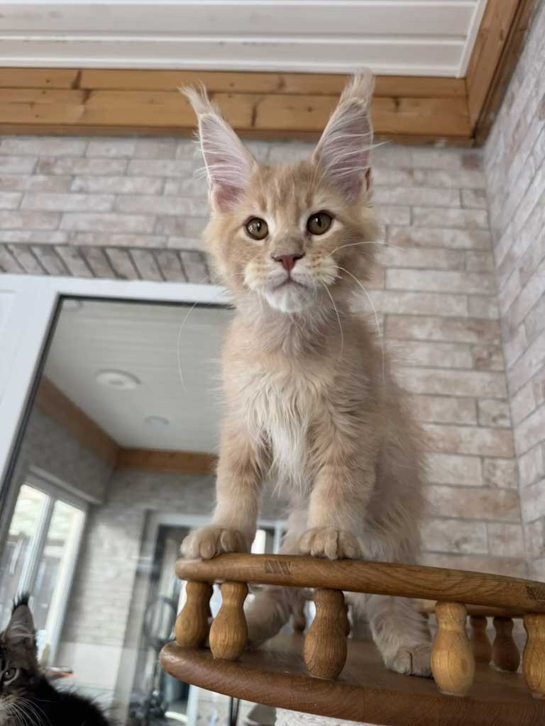 Unicum Sherrif — котёнок окраса кремовый тикированный (e25). Этот малыш отличается мягким характером и спокойным темпераментом. Его шерсть имеет нежный кремовый оттенок, который особенно красиво смотрится на густой структуре мейн-кунской шерсти. Шериф растёт уверенным и контактным котёнком.
