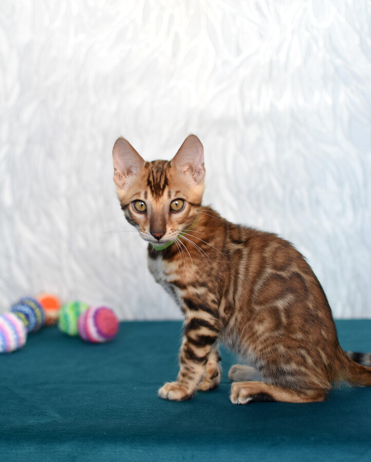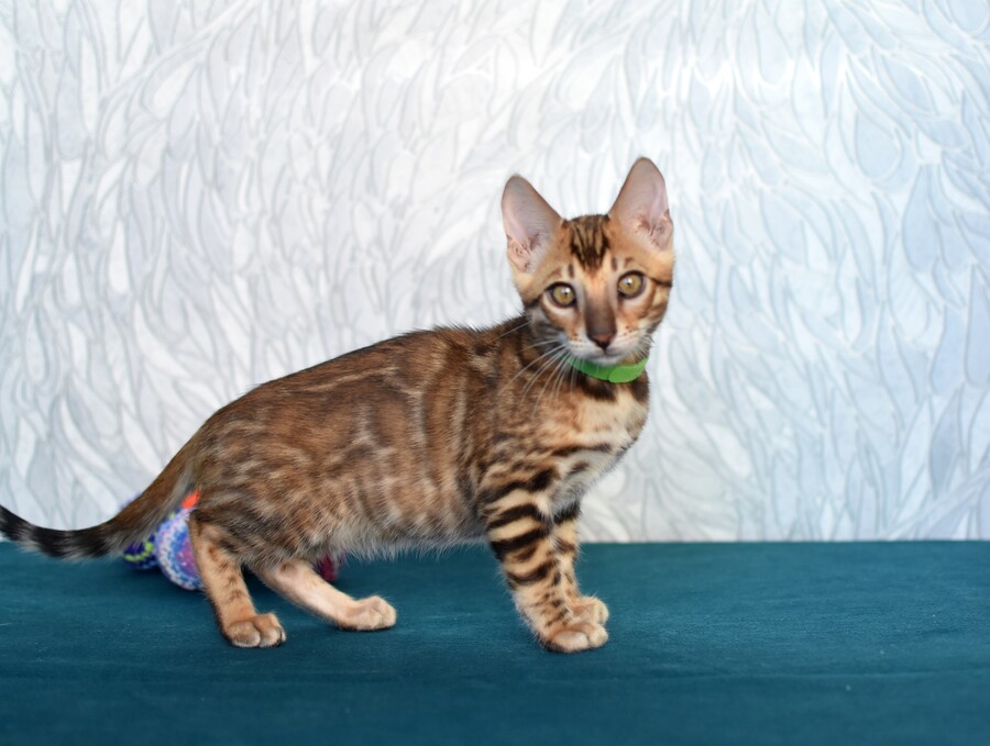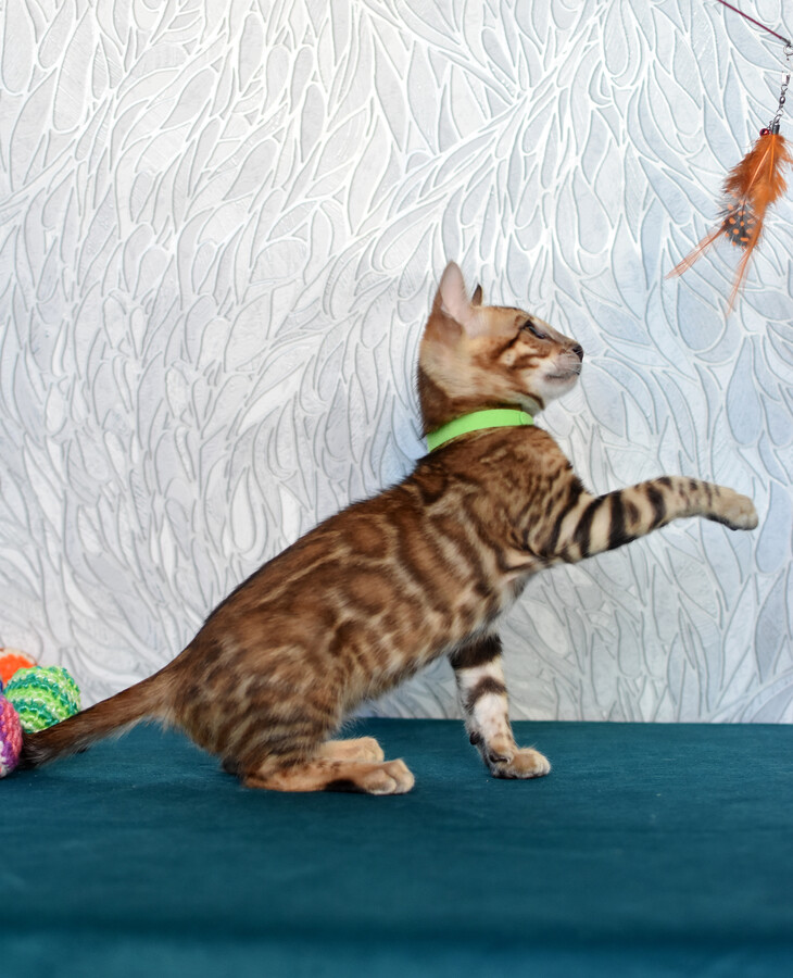 Kenzo — это не просто котёнок, а настоящий маленький леопард с благородным темпераментом. Его шёрстка украшена чётким, контрастным рисунком розеток на тёплом золотистом фоне, а мягкая и шелковистая текстура делает прикосновение к нему особенно приятным. Благодаря своему происхождению от тщательно подобранных производителей он полностью соответствует стандартам породы и обещает вырасти в статного, сильного и грациозного кота.