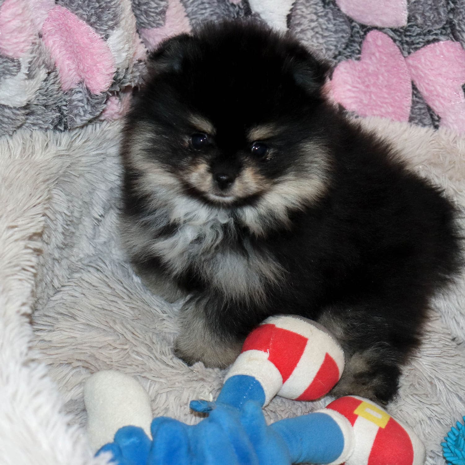 Окрас малышки — чёрно-подпалый, один из самых эффектных и востребованных в породе. Контрастная шерсть, аккуратная мордочка, тёмные выразительные глазки и пушистая «шубка» делают её невероятно фотогеничной и привлекательной. Ожидаемый рост во взрослом возрасте — 20–23 см, что идеально подходит для комфортной жизни в квартире и делает собачку удобной спутницей как для активных прогулок, так и для спокойных домашних вечеров.