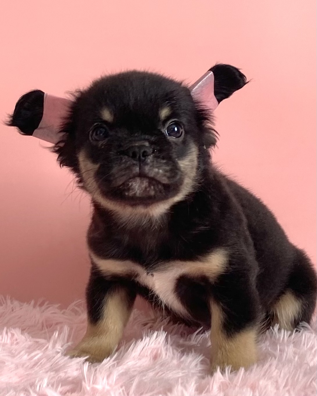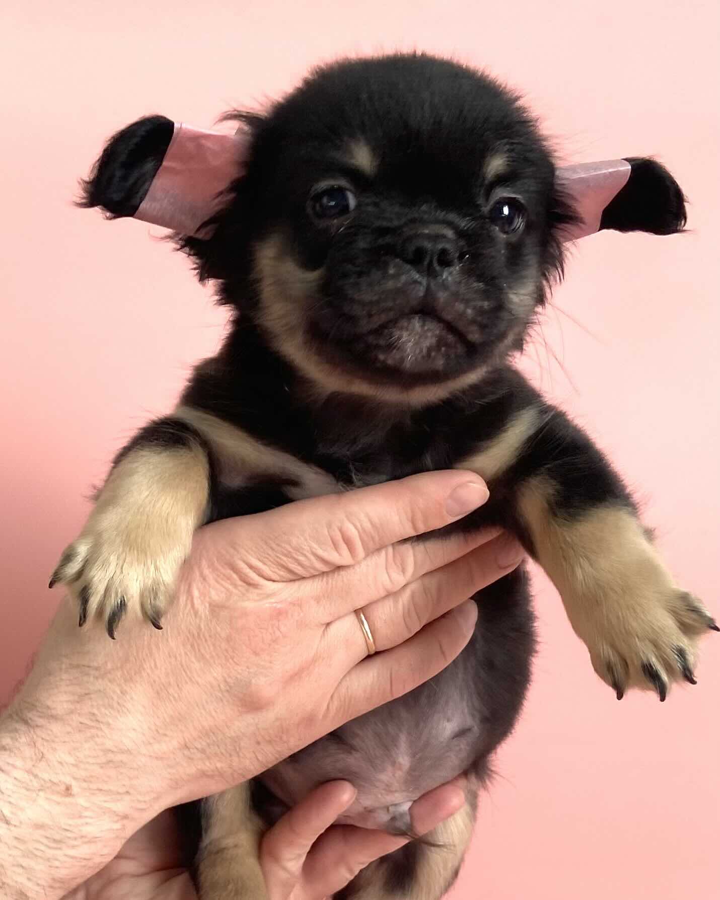 Мэйсон Френсис – щенок с очень выразительным обликом. Черный с подпалом окрас делает его особенно заметным, а тип флаффи придает внешности мягкость и редкость, которые ценят любители нестандартных линий. При этом для меня гораздо важнее, что мальчик сохраняет породную цельность. Он воспринимается как крепкий, гармоничный французский бульдог с хорошей подачей и уверенным щенячьим характером.