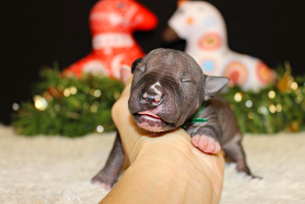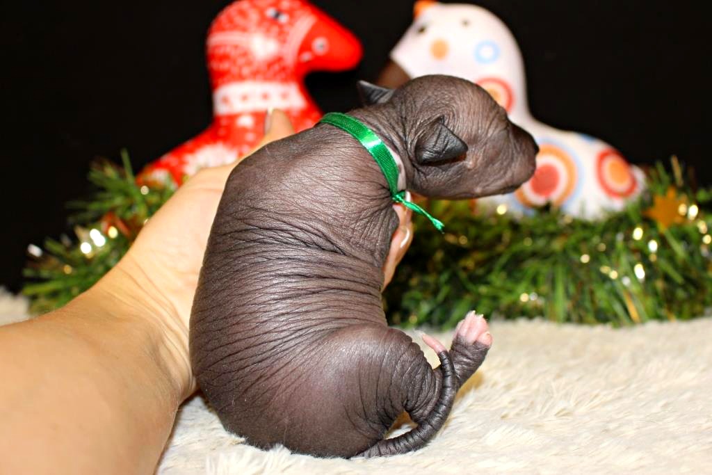 Предлагается к продаже породный щенок ксолоитцкуинтли, мальчик, полностью голый, чёрно-белого окраса, отмечен зелёной лентой. Щенок рождён от титулованных родителей с проверенной родословной и ярко выраженными породными качествами. Это перспективный представитель породы, подходящий как для выставочной карьеры и разведения, так и для жизни в семье.