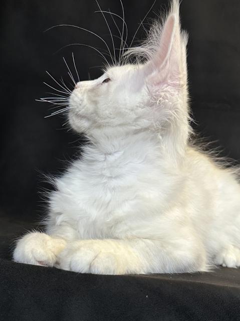 У малышки (или малыша — можно изменить при необходимости) уже формируются роскошные породные черты: крупные кисточки на ушах, удлинённое тело, мощные лапы и эффектное окрашивание, которое будет становиться ещё ярче с возрастом.