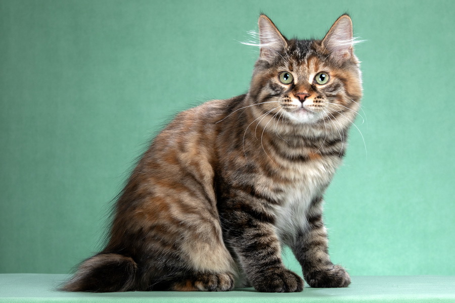 Окрас f 09 22 — черепаховый пятнистый с белым — делает её особенно выразительной. Контрастные пятна создают чёткий рисунок, а белые отметины добавляют глубину и подчёркивают анатомию. Полудлинная шерсть с плотным подшёрстком формирует объёмный силуэт, хорошо держит форму и защищает кошку.