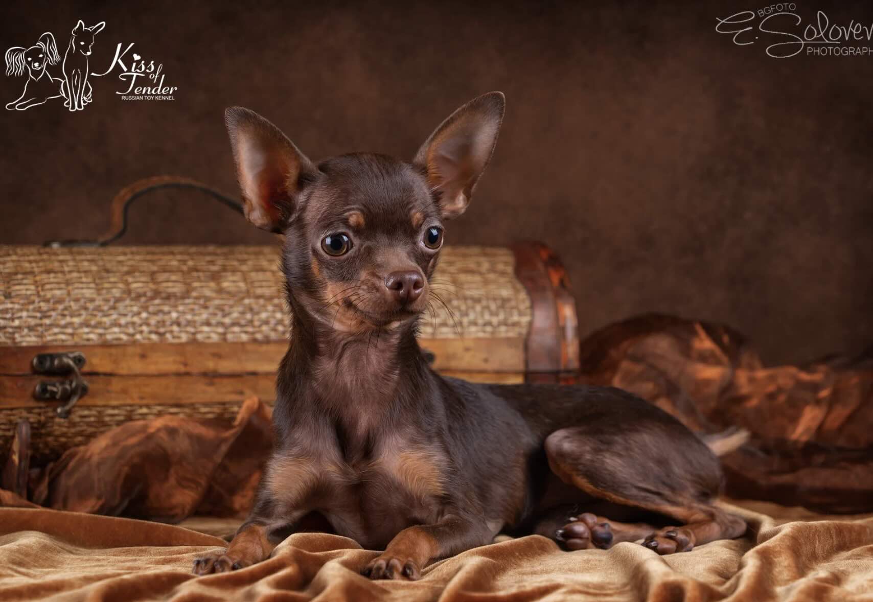 Кисс Оф Тендер Гламур – гладкошёрстный кобель коричнево-подпалого окраса. В 2 месяца весит 1097 г. Зубы 6х6, прикус ножницеобразный, родничка нет, семенники на месте, белых пятен и залома хвоста нет. Класс – пэт без брака. Стоимость – 60000 рублей.
