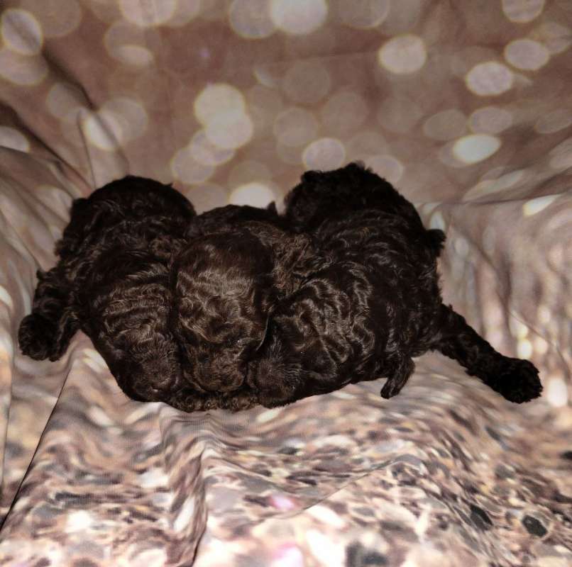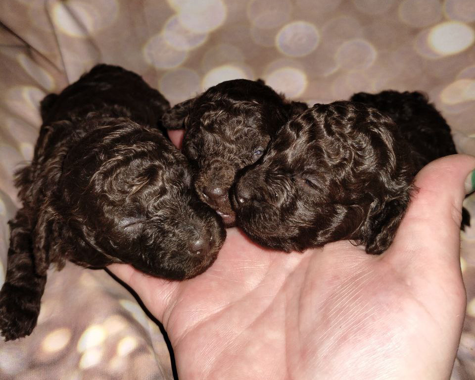 В нашем питомнике родился перспективный помёт той-пуделя коричневого окраса. Дата рождения — 21.12.2025. В помёте три щенка: два кобеля и одна сука. Все малыши ровные по типу, с гармоничным сложением, красивыми породными головами и выразительными глазами.
