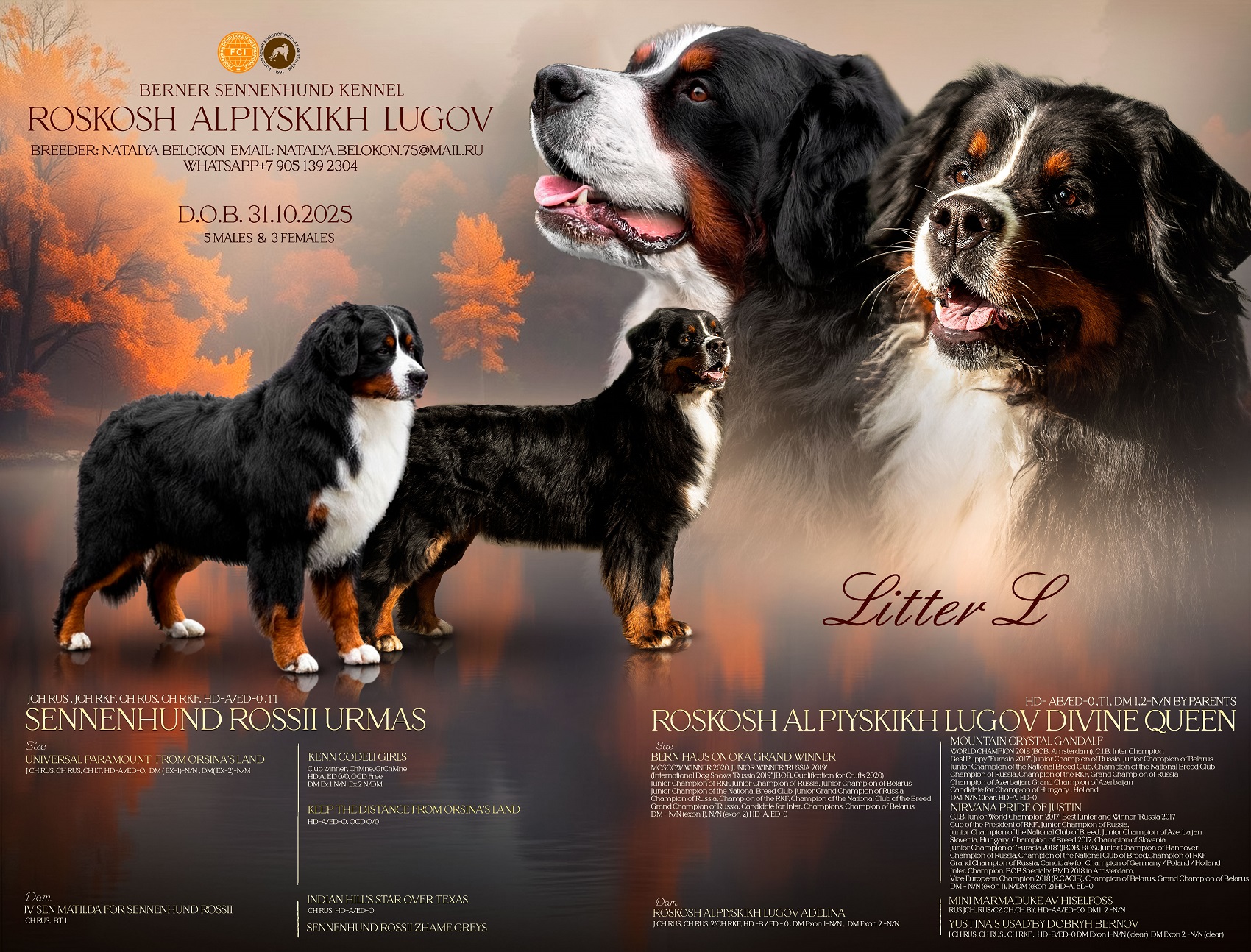 Мать — Роскошь Альпийских Лугов Дивине Куин ( Кэтти), прекрасная представительница породы, которая может гордится своим происхождением. В родословной Кэтти Чемпион Мира 2018г и Юный Чемпион Мира 2017г.