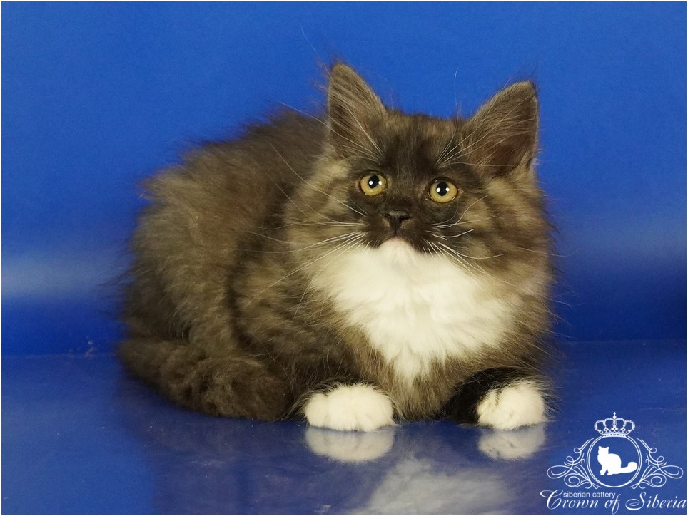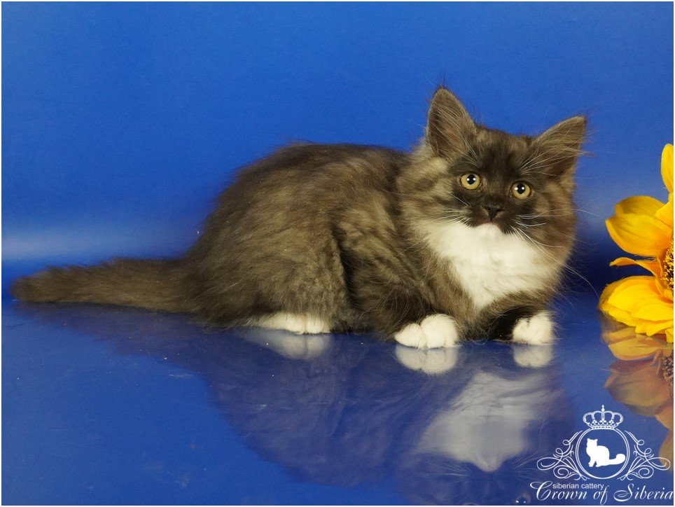 💎 Oksana (SIB ns 09) — сибирская кошка редкого окраса черный дымчатый с белым. На первый взгляд она кажется угольно-черной, но стоит малышке сделать шаг — и она буквально начинает светиться: белоснежный корень шерсти создает эффект серебряного сияния. Белые «перчатки», аккуратные носочки и нежное жабо делают образ по-настоящему аристократичным.