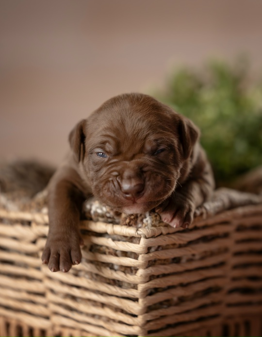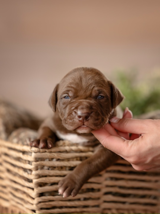 Этот кобель выделяется уже сейчас. Крепкий костяк, плотный формат, правильная линия верха и, что особенно важно, выраженная породная голова — не утяжелённая, а именно сбалансированная. Та самая «питбульская» анатомия, которую невозможно получить случайно. Такие щенки не появляются часто, и, как правило, в питомниках их оставляют под собственную работу.