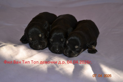 04 апреля 2026 года родился помет щенков цвергшнауцера окраса черный с серебром – три девочки и два мальчика. Это выразительные, породные малыши с интересной родословной и тем самым классическим типом, который ценят в цвергшнауцере за узнаваемый силуэт, темперамент и эффектную внешность.