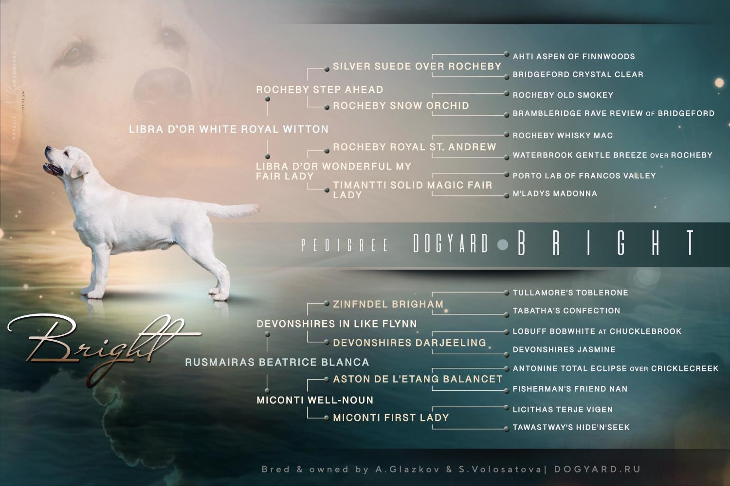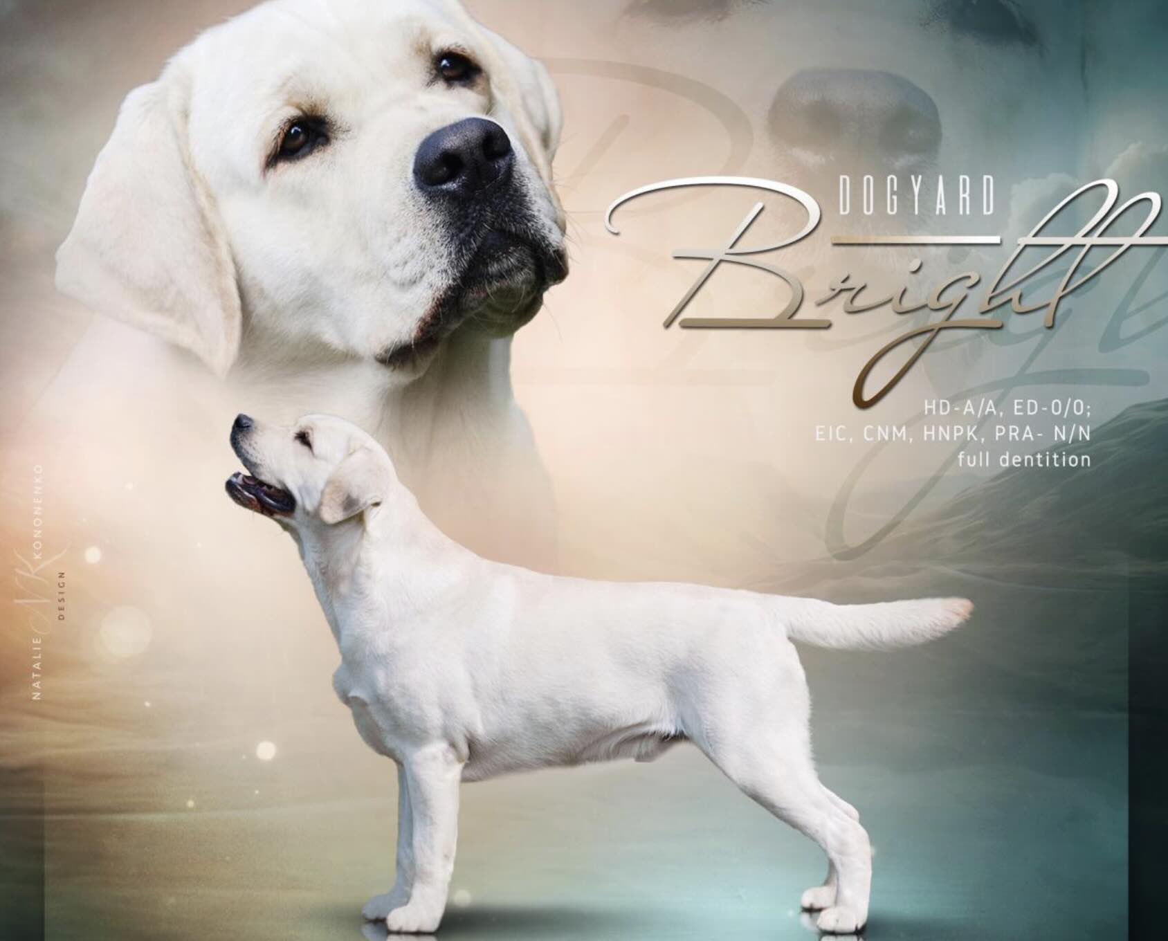 Отец помёта — DOG YARD BRIGHT — кобель крепкого формата, с выразительной головой, мощной грудной клеткой и правильным «выдровым» хвостом. Он генетически чист по основным наследственным заболеваниям породы, включая prcd-PRA, CNM, EIC и наследственный носовой паракератоз. Мать — BELLE DE ROVEAL FIRST FEELING — гармоничная сука с мягким породным выражением, отличным балансом корпуса и устойчивой нервной системой. В этом сочетании мы стремились закрепить крепкий костяк, качественный шерстный покров и типичный для лабрадора доброжелательный темперамент.