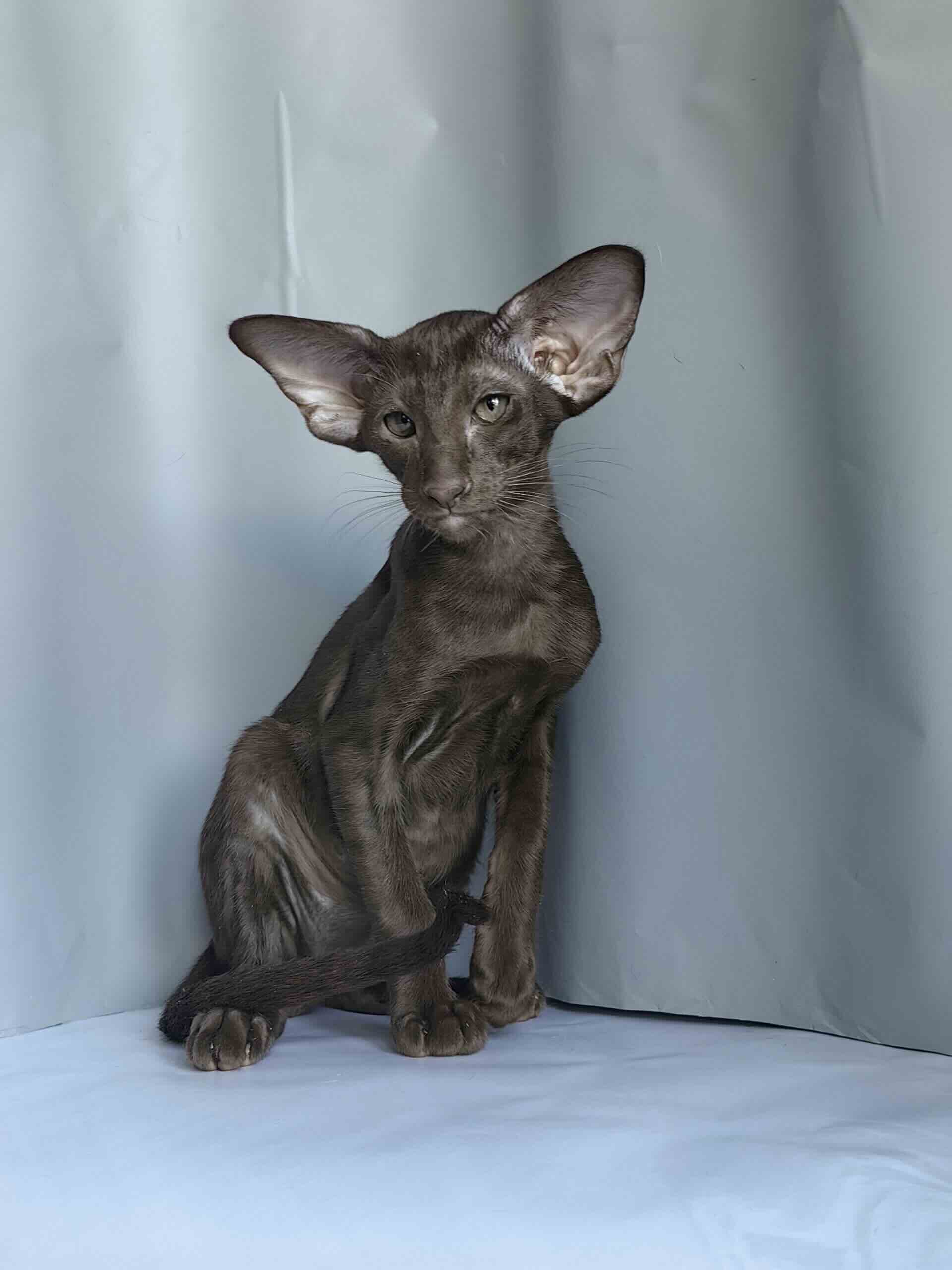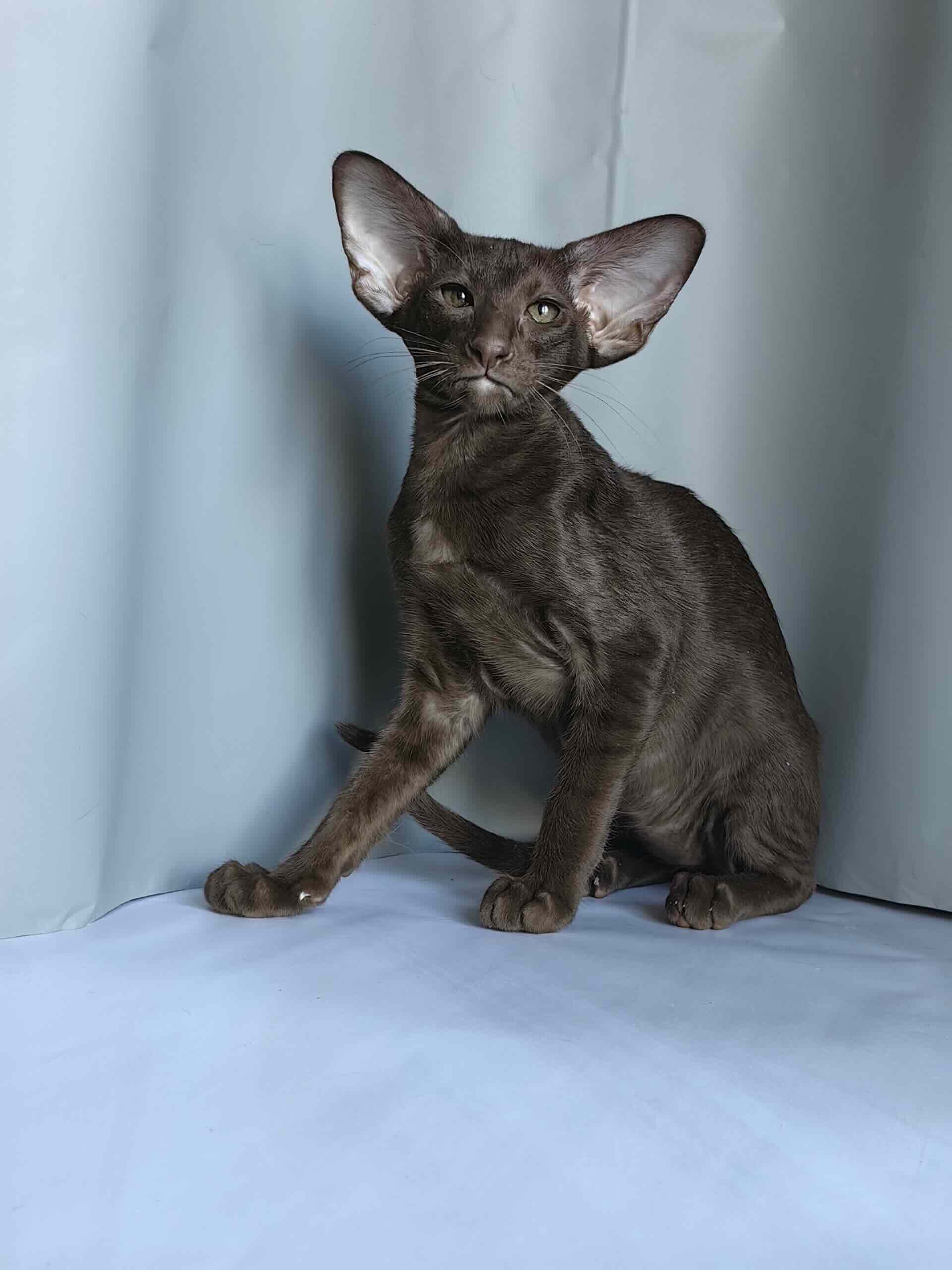 Внешне котёнок уже сейчас демонстрирует правильный ориентальный формат: удлинённое тело с тонким костяком, длинные конечности, гибкая линия верха. Голова клиновидная, без излишней округлости, с хорошей глубиной и правильным профилем. Уши крупные, широко поставленные, создают тот самый выразительный силуэт, который отличает качественного ориентала от «упрощённого» типа.