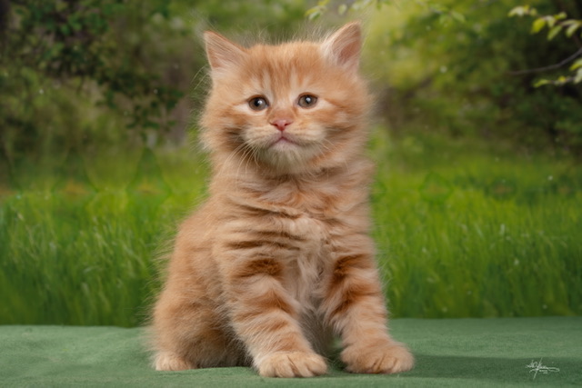 Din’-din’ Order of the Phoenix – девочка красного окраса. В карточке указан окрас d, красный солид. И это именно тот случай, когда простое наименование не передает всего впечатления от животного. Красные кошки в породе всегда цепляют взгляд. В них есть тепло, энергия, внутренний свет и очень сильная индивидуальность. Особенно интересно, когда красный окрас встречается у девочки. Это смотрится необычно, живо и очень запоминается. Такая кошка в доме никогда не будет фоном. Она обязательно станет заметной фигурой – и визуально, и по характеру, и по общему присутствию. Красный цвет вообще удивительно работает на эмоциональное восприятие животного. Он делает образ ярче, теплее, солнечнее, и в полудлинношерстном формате это раскрывается особенно красиво.