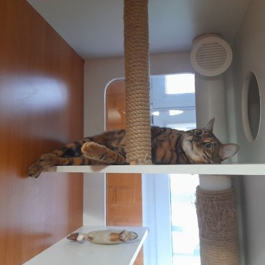 Но самое удивительное место в нашем отеле — это ЗООТЕКА. Если бы кошки умели строить дома мечты, они создали бы именно такую конструкцию. Это целый мир из ступенек, уютных домиков, карнизов и когтеточек, где можно лазать, прыгать и исследовать новые вершины. Наши постояльцы с удовольствием проводят здесь время, играя друг с другом (под чутким присмотром персонала) или просто наблюдая за происходящим с высоты.
