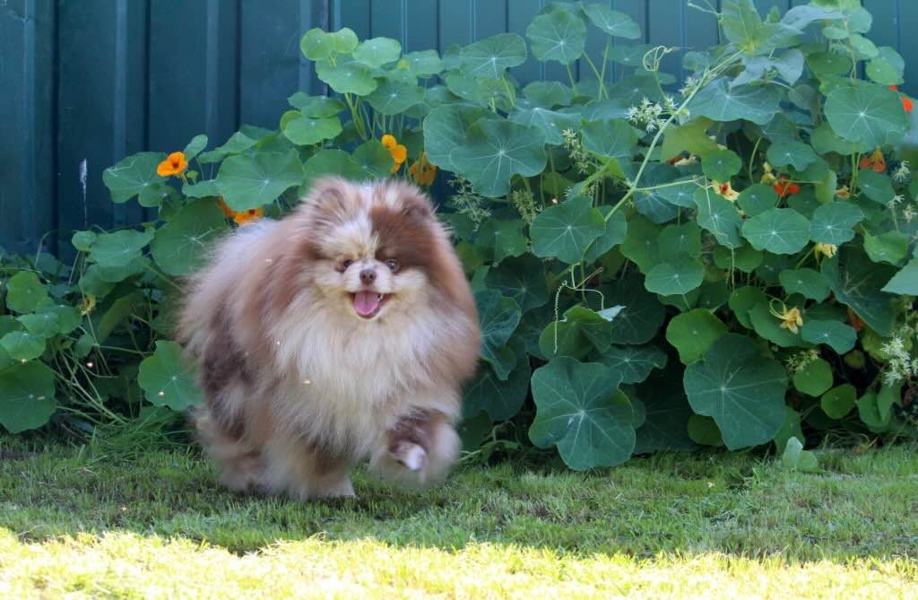 Легенда России — кобель небольшого роста (22 см) и гармоничного веса около 2,5 кг. Он не перегружен, при этом имеет достаточный костяк и плотную, собранную конституцию. Корпус короткий, компактный, с правильной линией верха и хорошим поставом хвоста, что создаёт тот самый силуэт «шарика», к которому стремится большинство заводчиков.