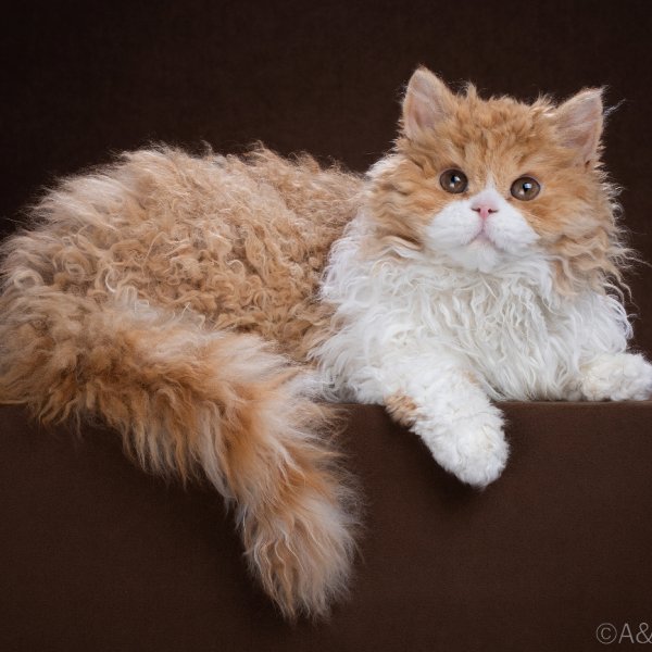 Окрас красный биколор (SRL d 03) придаёт кошке особенно яркий и запоминающийся облик. Сочетание насыщенного красного пигмента с белыми участками всегда смотрится нарядно, а на длинной рексовой шерсти такой окрас раскрывается ещё выразительнее. Шерстный покров у Морковки объёмный, с породной текстурой и хорошо заметным завитком, что крайне важно для селкирк-рекса длинношерстного. Именно такая шерсть создаёт тот самый «плюшево-облачный» эффект, за который породу так ценят и в ринге, и в разведении.