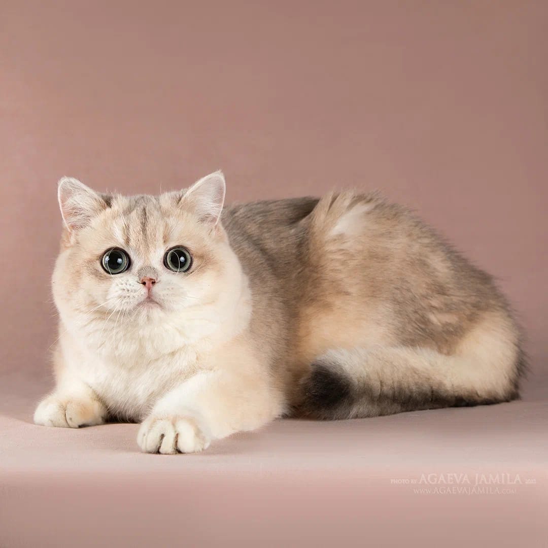 Окрас black golden blue chinchilla ay11 делает его особенно интересным для разведения. Голубое золото смотрится мягче и деликатнее классического ny11, при этом сохраняет дорогой тёплый фон и нарядный шиншилловый эффект. Такая генетика важна для получения котят британской золотой шиншиллы редких, красивых окрасов.