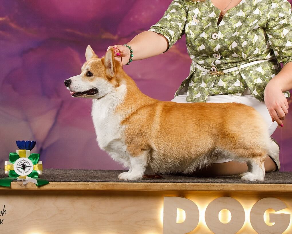 Джина — собака крепкого сложения с правильным форматом, хорошо развитой мускулатурой и отличными движениями. Её экстерьер полностью соответствует стандарту породы: гармоничные пропорции, выразительная голова, правильная линия верха и уверенная, свободная рысь. Это не «декоративная» корги, а полноценная рабоче-выставочная сука с отличной выносливостью и балансом.