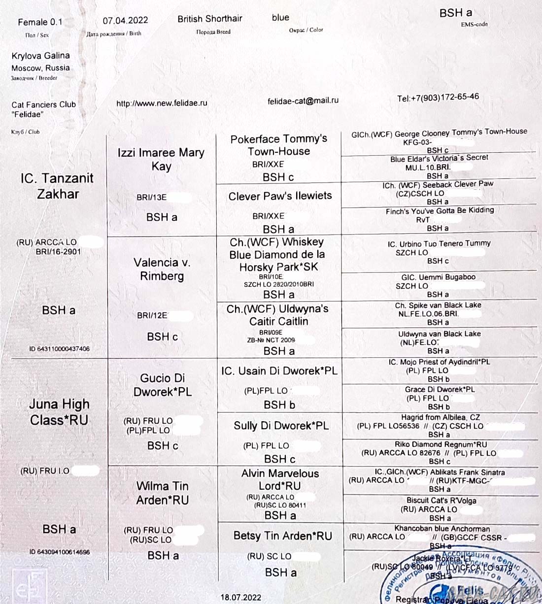 Аннабель полностью обследована по здоровью: ретровирусы FIV и FeLV — отрицательные, PKD — нормальный генотип, подтверждена короткошерстность (L/I), группа крови A/b.
