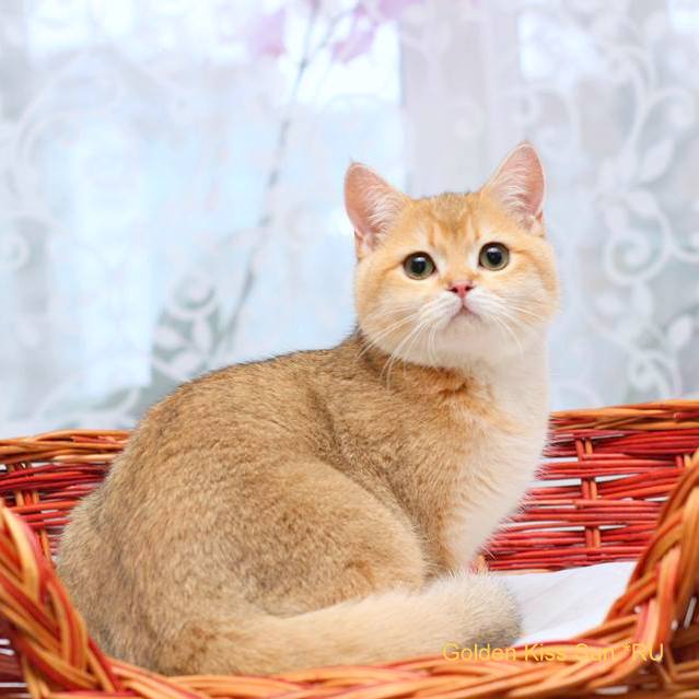 Эта роскошная кошка окраса BRI ny 12 (золотая шиншилла) воплощает классический британский тип: гармоничное телосложение, плотный костяк, округлую голову с выразительными, широко посаженными глазами и мягкую, шелковистую шерсть с изысканным золотым переливом. Ее окрас выглядит особенно эффектно за счет чистого светлого подшерстка и аккуратного затемнения на кончиках волоса, создающего тот самый «сияющий» шиншилловый эффект.